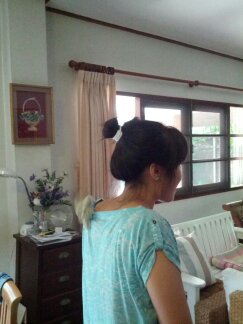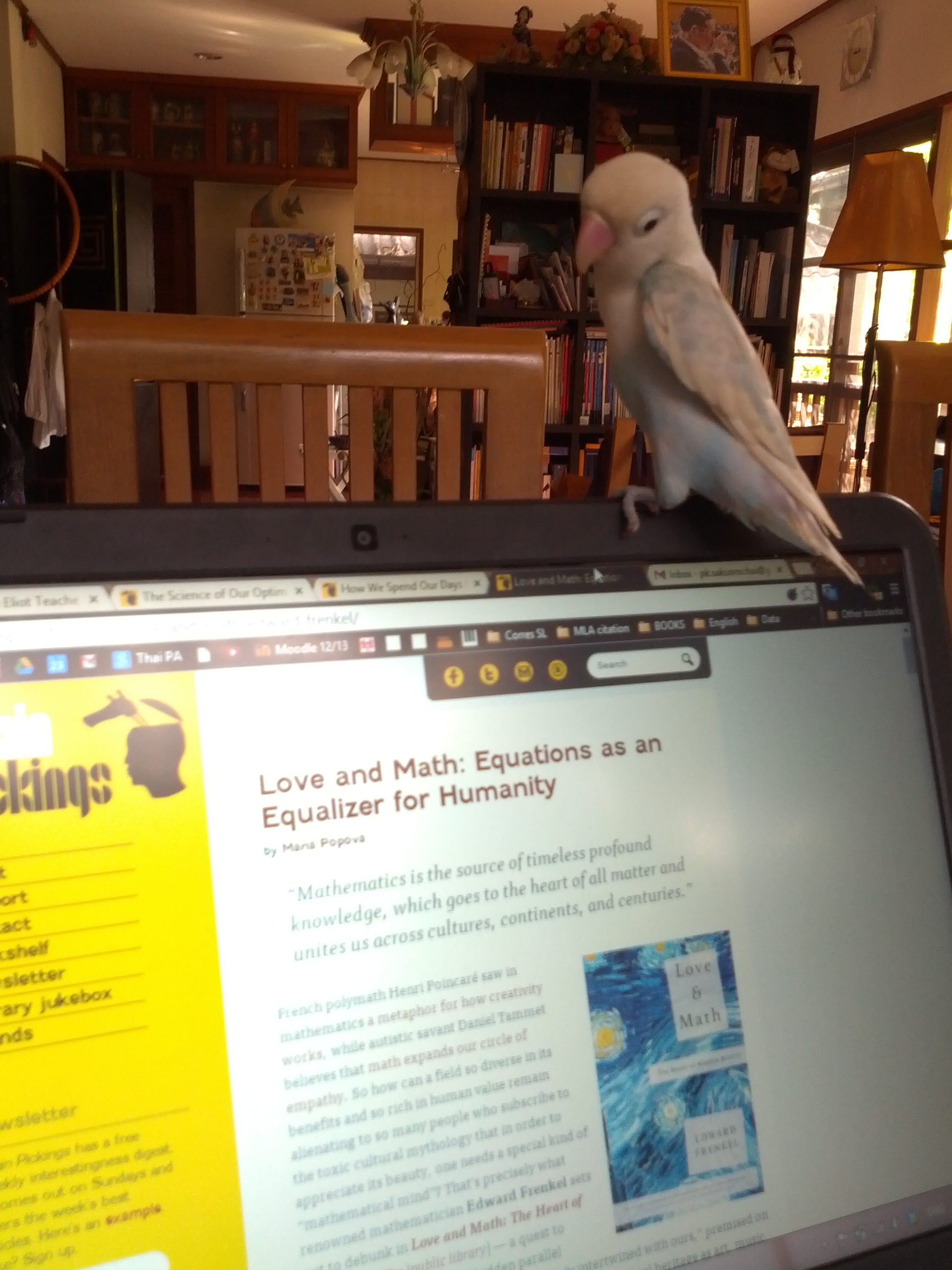Her name is Yokyek. She’s missing a foot, so when she walks she wobbles from side to side as her stumpy leg is shorter than the other foot-equipped leg. That’s actually why she lives in the house. My friend’s lovebirds (she has many of them) are normally kept in a cage outside the house, but Yokyek must have fallen in the cage when she was very young. So they took her in to nurse her. And now she’s a housebird. And a wilful little one at that.